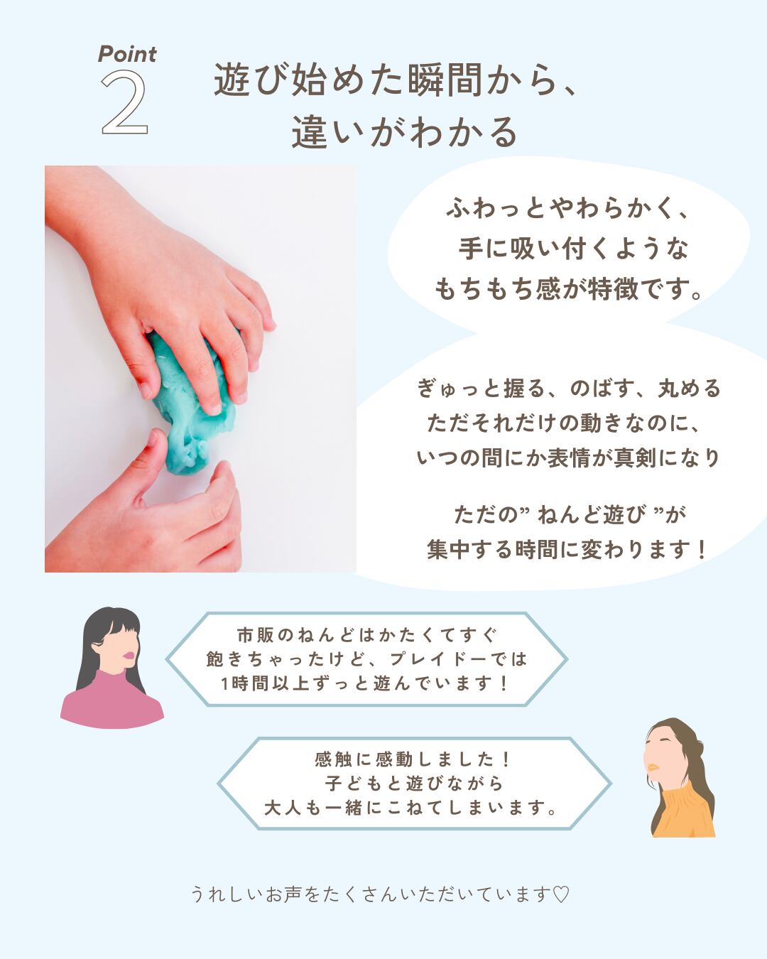 「市販のねんどはかたくてすぐ飽きちゃったけど、プレイドーでは1時間以上ずっと遊んでいます!」